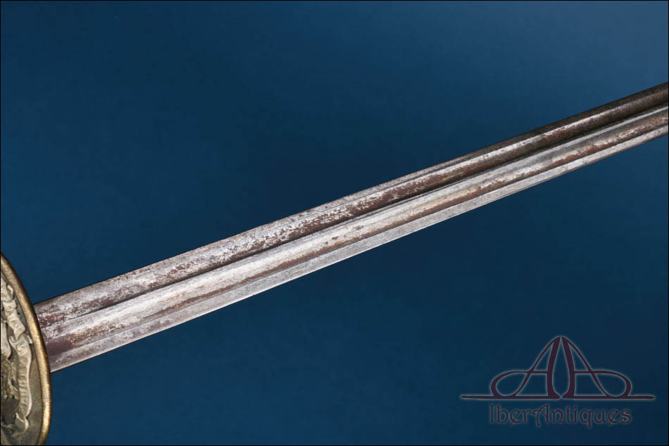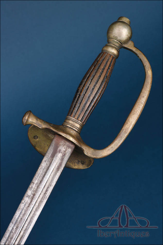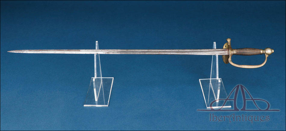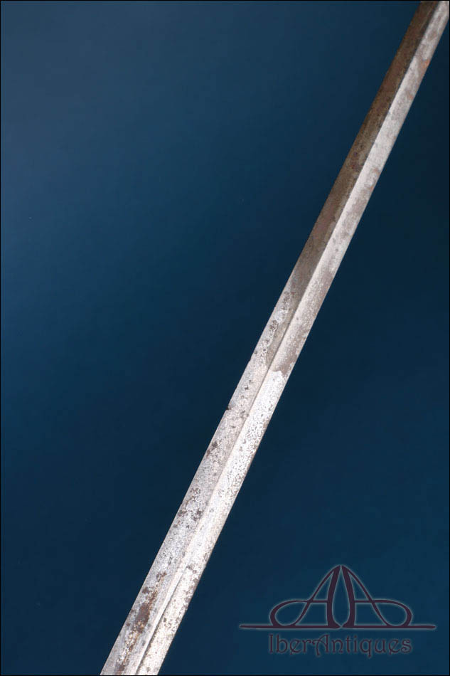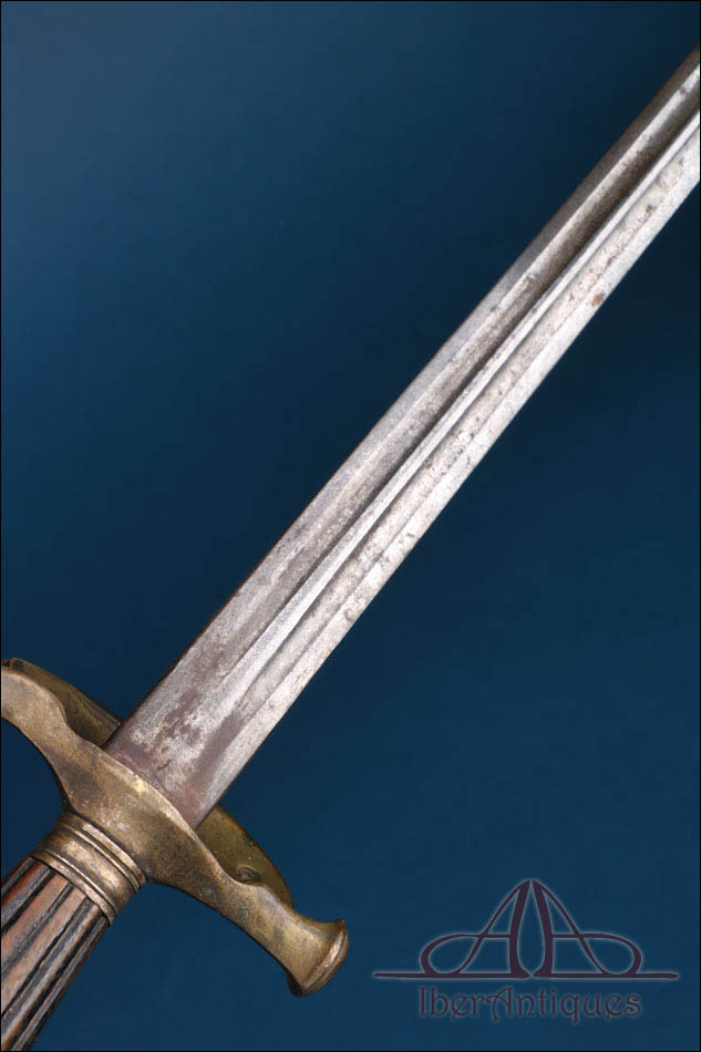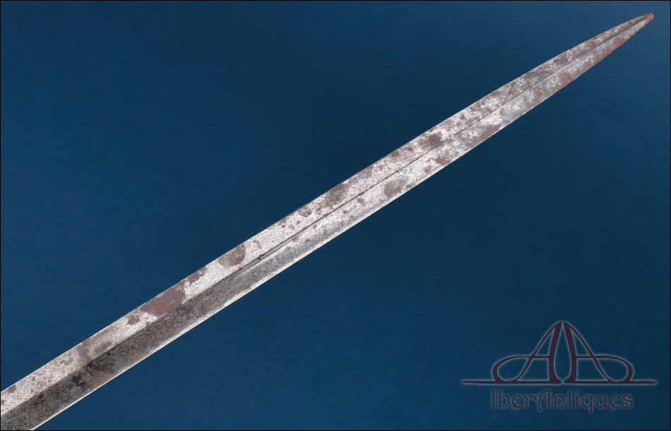 El estado de conservación es acorde a una pieza utilizada. La hoja presenta oxidación, manchas y desgaste generalizado que evidencian su antigüedad y uso histórico. La montura muestra envejecimiento superficial, con pérdida parcial de uniformidad en el acabado del latón y roces visibles en distintas zonas. No conserva la vaina. A pesar de ello, la espada mantiene su estructura completa y permite una identificación clara de su tipología y función original.