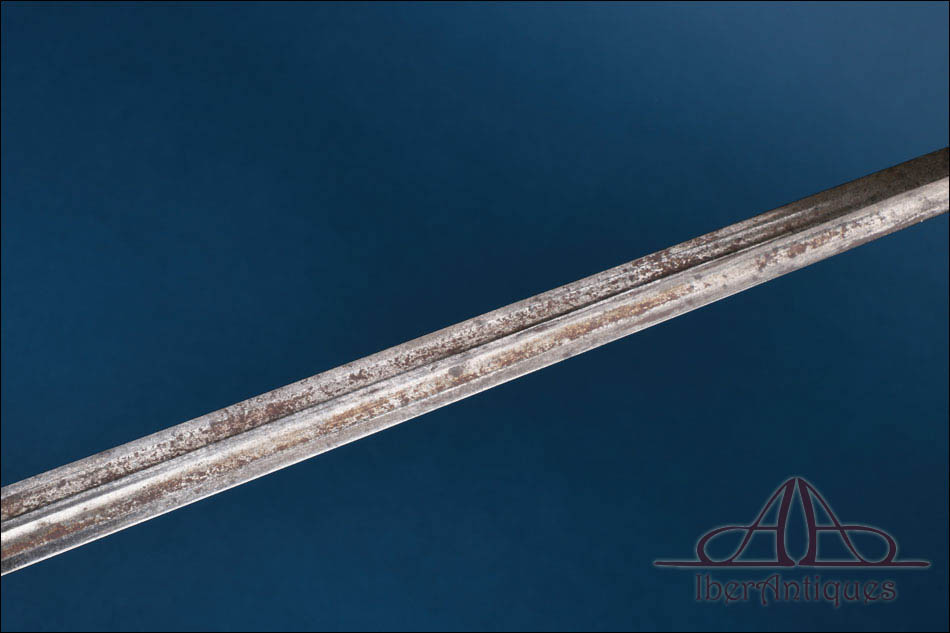 La hoja es recta, de acero, con doble acanaladura longitudinal que aligera el peso sin comprometer la rigidez estructural. Su configuración responde a criterios prácticos de resistencia y eficacia en acciones de contención o enfrentamiento cuerpo a cuerpo, características propias del armamento policial militarizado de la época. La punta es aguda y mantiene la geometría funcional típica de las espadas de servicio urbano del siglo XIX.