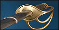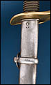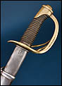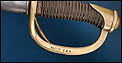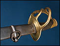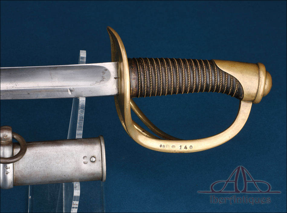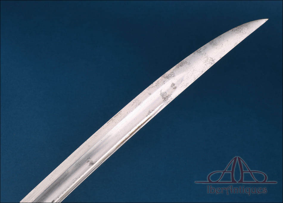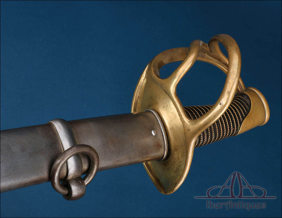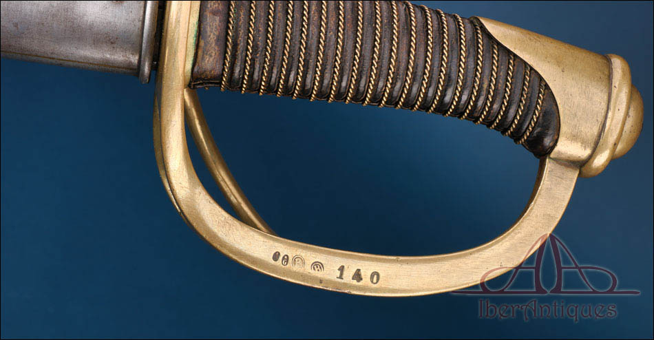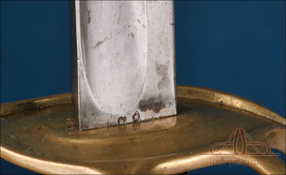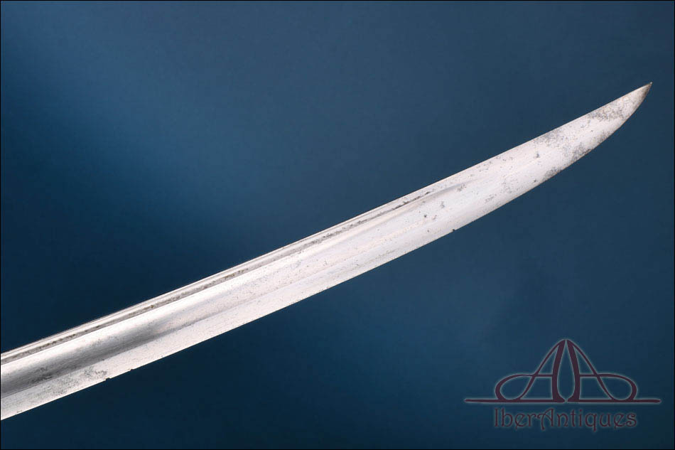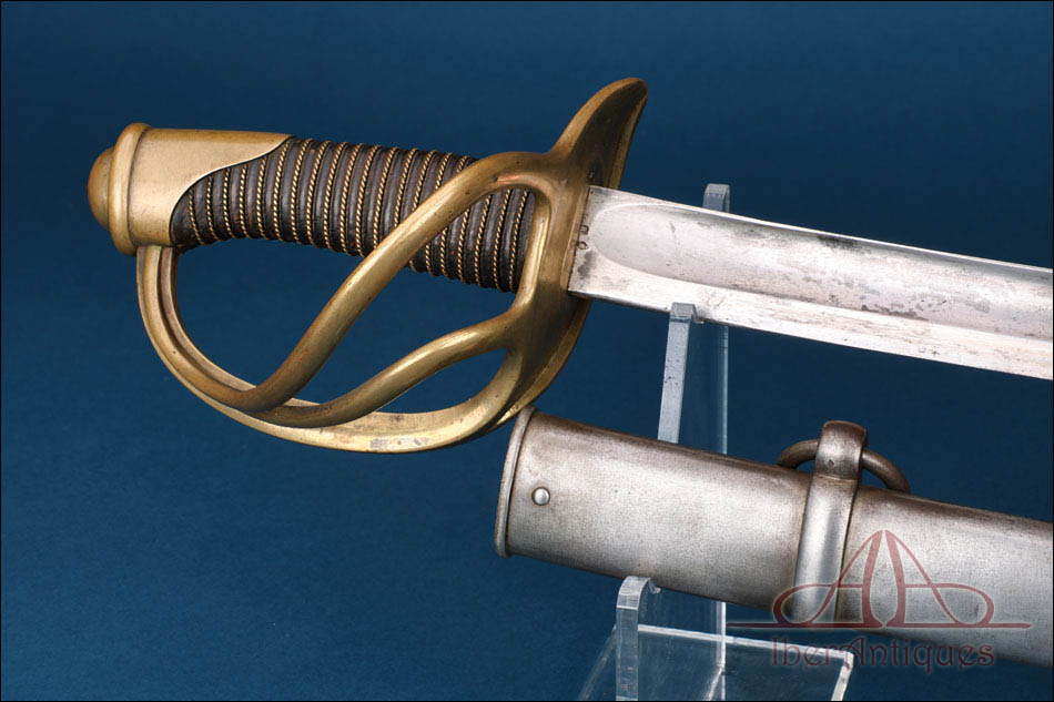 La montura está realizada en latón y presenta la clásica guarnición de tres ramas, sólida y envolvente, concebida para ofrecer protección eficaz a la mano sin comprometer la maniobrabilidad del arma. El pomo, integrado en la monterilla, sigue fielmente el diseño reglamentario característico de este modelo. El puño conserva su recubrimiento original de cuero oscuro, acompañado de alambrado de latón o torzal dispuesto en espiral, lo que garantiza un agarre firme y aporta además un aspecto muy atractivo al conjunto. La empuñadura muestra una conservación muy buena, con desgaste lógico acorde con su antigüedad.