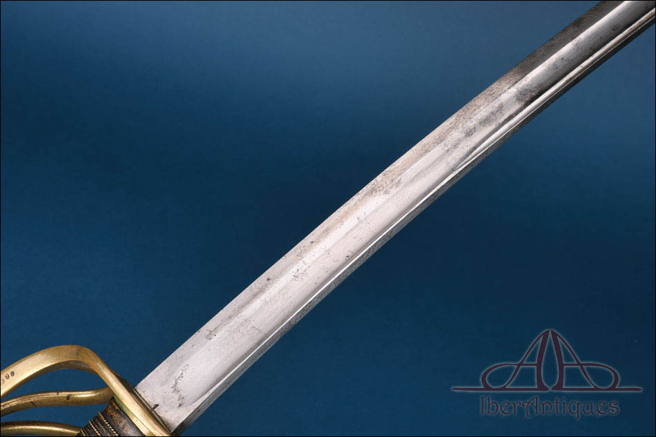 Excelente sable francés reglamentario de caballería ligera modelo 1822, fabricado en la Manufacture d’Armes de Châtellerault y fechado en mayo de 1879 según la inscripción visible en el lomo de la hoja. Se trata de uno de los modelos más representativos del armamento militar francés del siglo XIX, con una tipología claramente definida y una presencia que transmite de inmediato su carácter histórico. Su diseño responde a los estándares establecidos para la caballería ligera, donde la funcionalidad, el equilibrio y la rapidez de uso resultaban fundamentales.