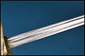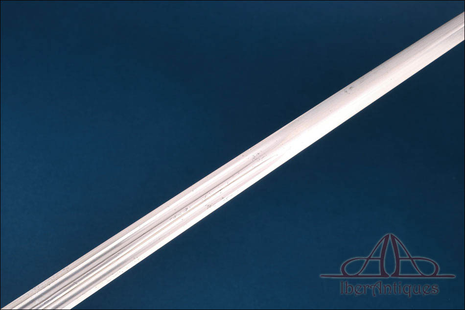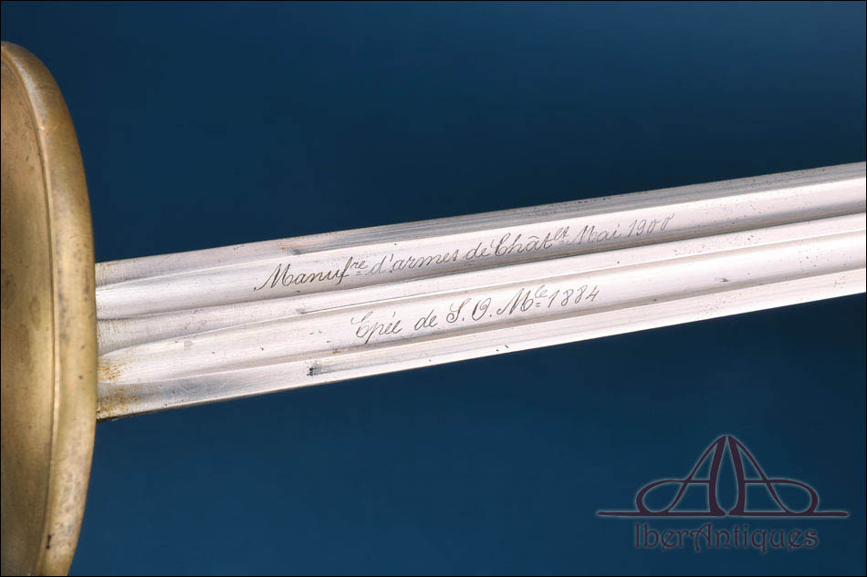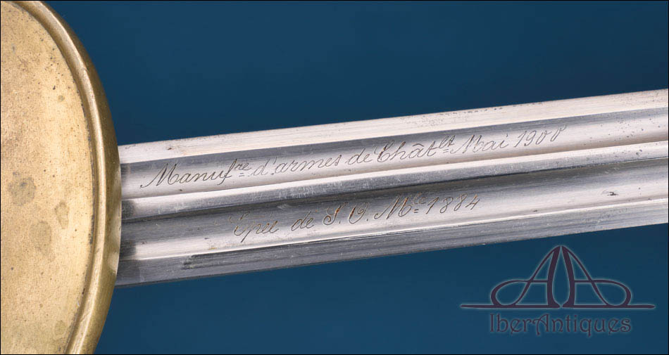 La hoja es recta, hecha de acero, larga y estilizada, con acanaladuras longitudinales bien definidas que recorren gran parte de su superficie. En la zona del arranque se conserva la inscripción de fabricación, donde se menciona la Manufacture d’Armes de Châtellerault junto a la fecha de mayo de 1900 y la referencia al modelo 1884. La espada conserva su vaina metálica original y presenta una conservación muy buena, con su anilla de suspensión.