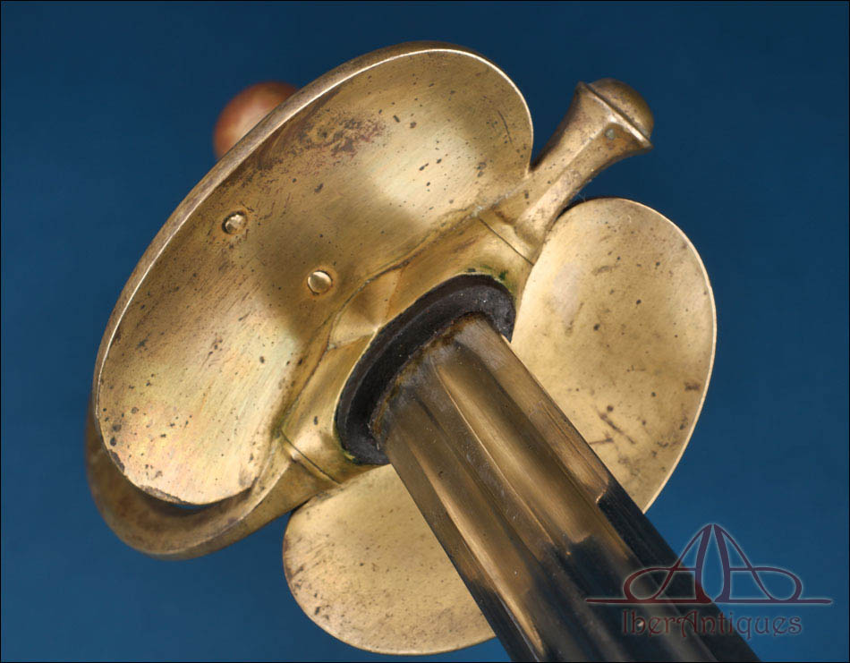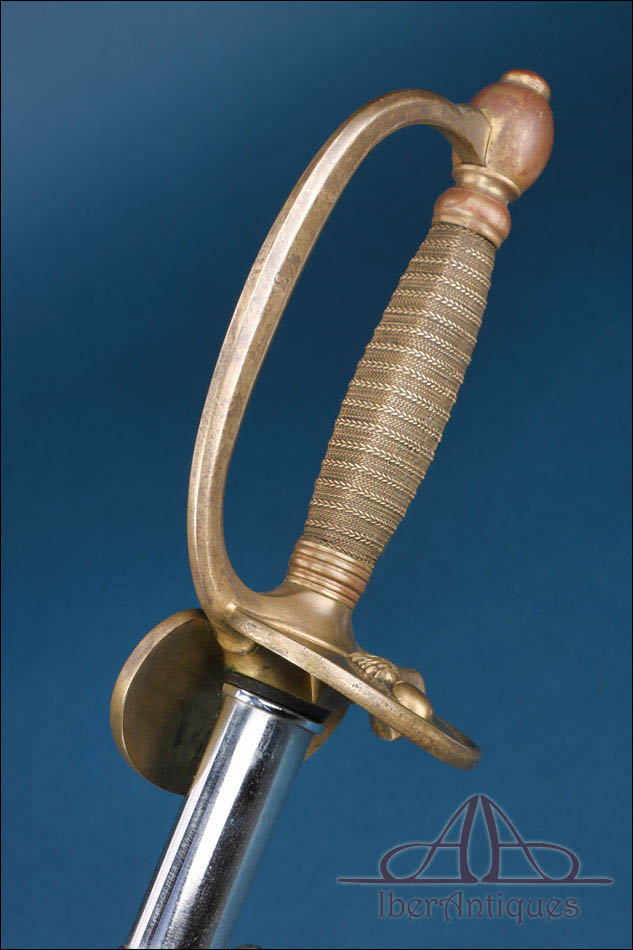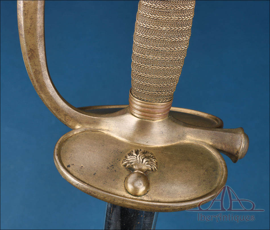 La concha ovalada muestra en relieve una granada flameante, símbolo militar habitual en este tipo de armas reglamentarias francesas y elemento identificativo del ámbito de la infantería. En la parte posterior se conserva la pieza abatible propia del modelo, integrada en la montura y vinculada al sistema de porte, detalle técnico que contribuye a la autenticidad tipológica de la espada.