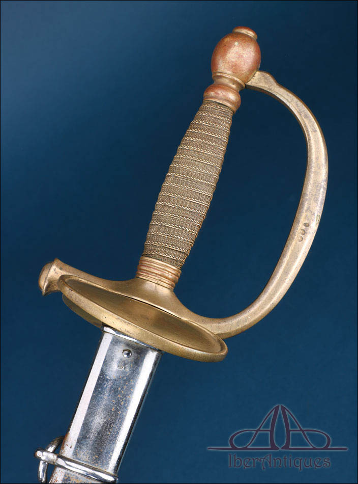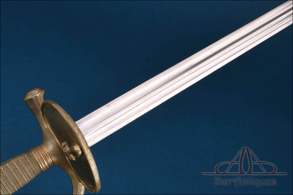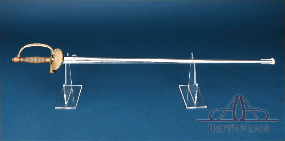Excelente espada francesa antigua de suboficial de infantería modelo 1884, fabricada en la Manufacture d’Armes de Châtellerault y fechada en mayo de 1900 según la inscripción visible en la hoja. La montura está realizada en latón y presenta una configuración de una sola rama curva, robusta y eficaz en la protección de la mano, aportando al mismo tiempo una silueta limpia y equilibrada. El pomo, de forma ovoide, remata una empuñadura de proporciones armoniosas. El puño conserva su alambrado metálico o torzal original, enrollado de forma regular y firme, lo que garantiza una sujeción adecuada y añade interés visual al conjunto.