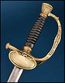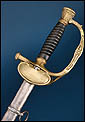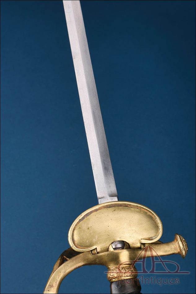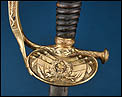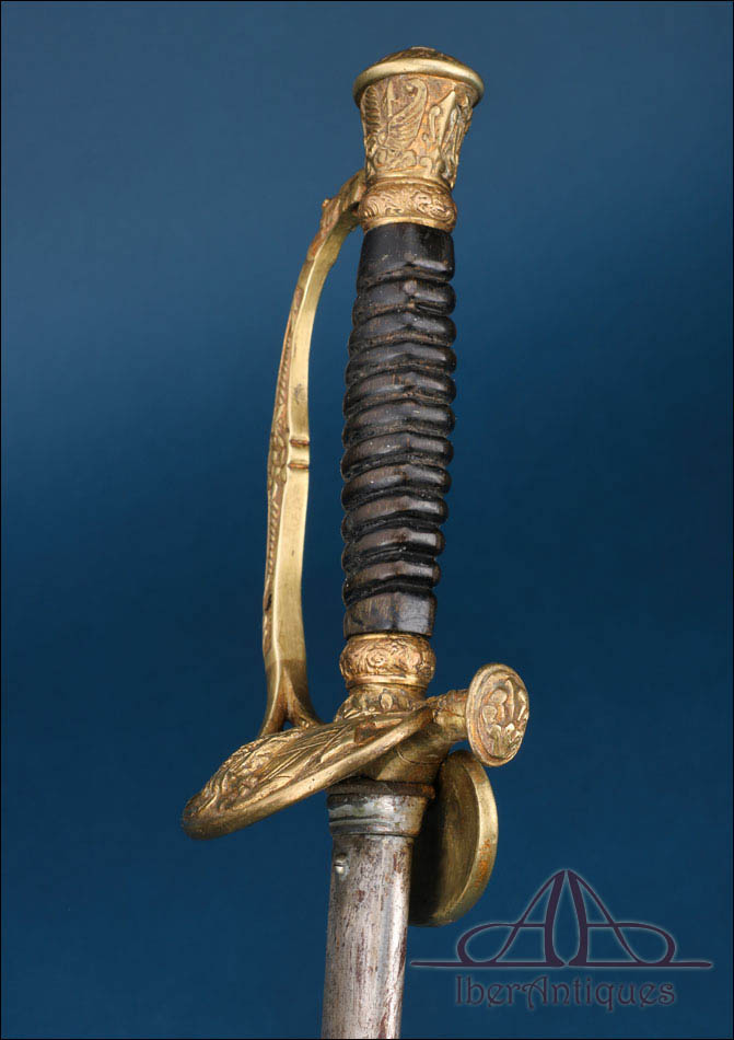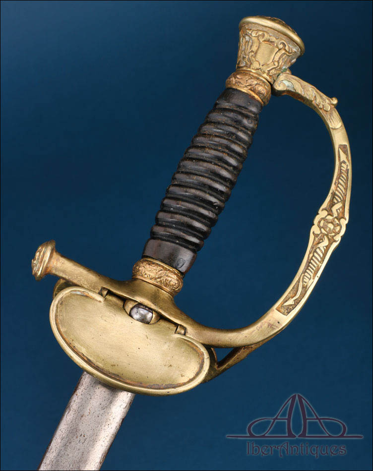 La montura está realizada en latón dorado y presenta una ejecución cuidada, con decoración cincelada visible en varios de sus elementos. El arco de unión muestra ornamentación en relieve, con motivo central en forma de roseta, aportando elegancia y personalidad a la empuñadura. El pomo, de forma troncocónica, se integra con armonía en el conjunto y mantiene la estética característica de este tipo de espadas francesas de oficial superior. En la parte posterior conserva además la contra guarda abatible, detalle técnico propio de este tipo de modelos reglamentarios.