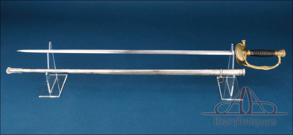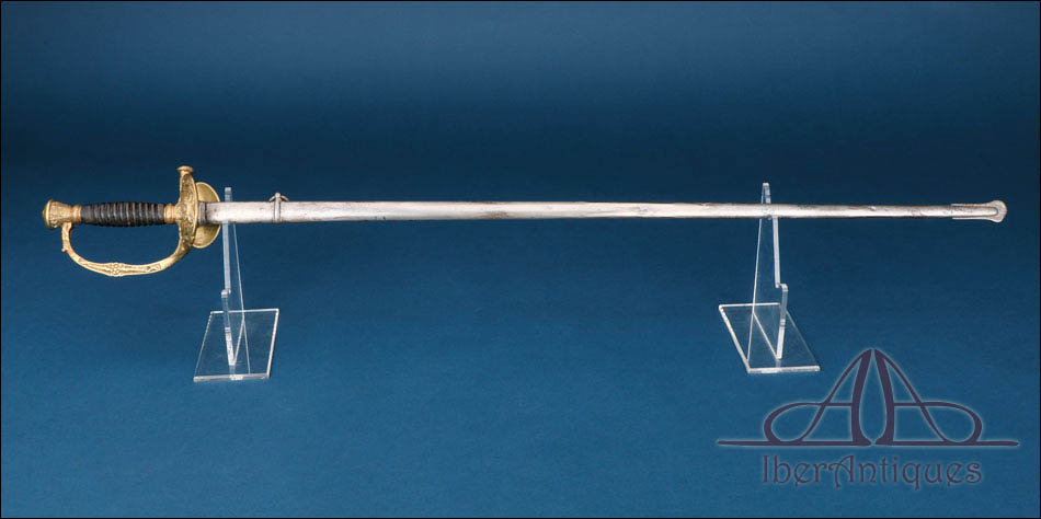 Conserva su vaina metálica original, de hierro, con un anillo de suspensión, elemento que completa el conjunto y refuerza su interés coleccionista. La vaina está igualmente en muy buen estado de conservación lo que siempre añade valor en este tipo de piezas, especialmente cuando se trata de modelos de oficial.