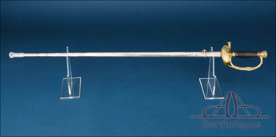 Elegante antigua espada francesa de oficial superior de todas las armas, correspondiente al modelo 1872/84 y fechable en época de la Tercera República. Se trata de una pieza reglamentaria de notable calidad, concebida para oficiales de graduación elevada y claramente representativa del refinamiento formal que caracteriza a determinadas armas blancas francesas de finales del siglo XIX y comienzos del XX. Su tipología combina sobriedad militar, riqueza ornamental y una silueta muy equilibrada, dando lugar a un conjunto especialmente atractivo desde el punto de vista histórico y coleccionista.
