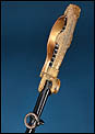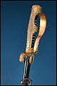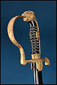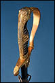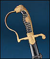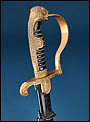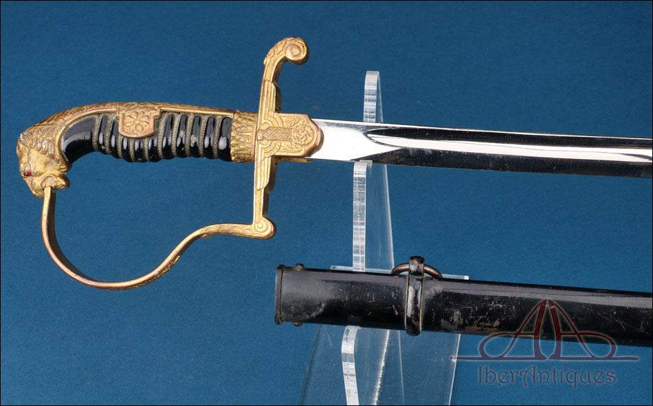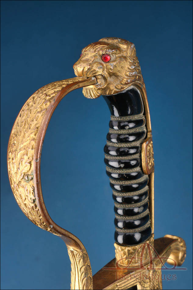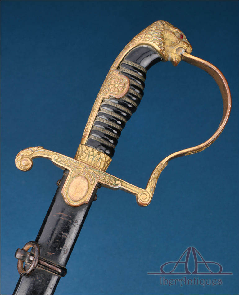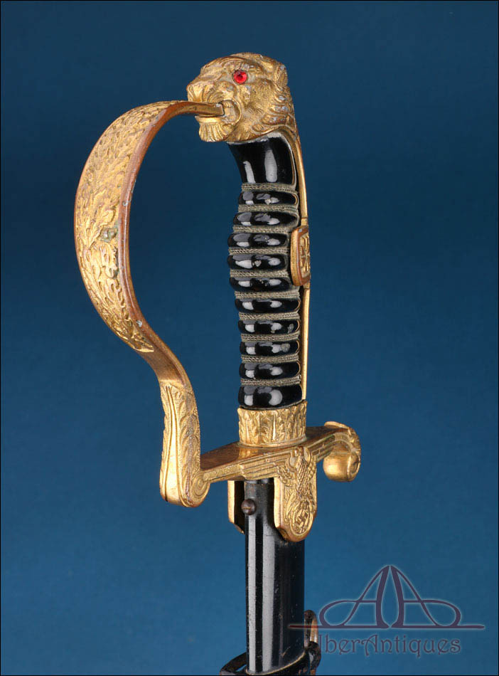 La montura está realizada en metal dorado y presenta una configuración muy característica de este tipo de sables de oficial alemanes. El pomo adopta forma de cabeza de león, con ojos de cristal rojo, detalle especialmente llamativo que aporta fuerza visual al conjunto. El arco principal de la empuñadura muestra una amplia curvatura y conserva decoración vegetal grabada, en armonía con el resto de la montura. Los gavilanes inferiores, de extremo enrollado, completan una silueta elegante y bien equilibrada, muy propia de este modelo de oficial.