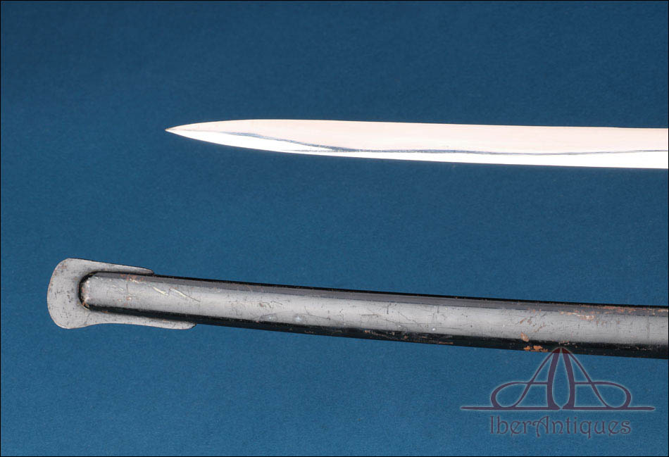 La vaina es metálica y conserva su acabado negro original. Presenta desgaste superficial, roces y pérdidas de acabado en distintos puntos, compatibles con el uso y con el paso del tiempo, pero mantiene bien su forma general y completa el conjunto con el sable.