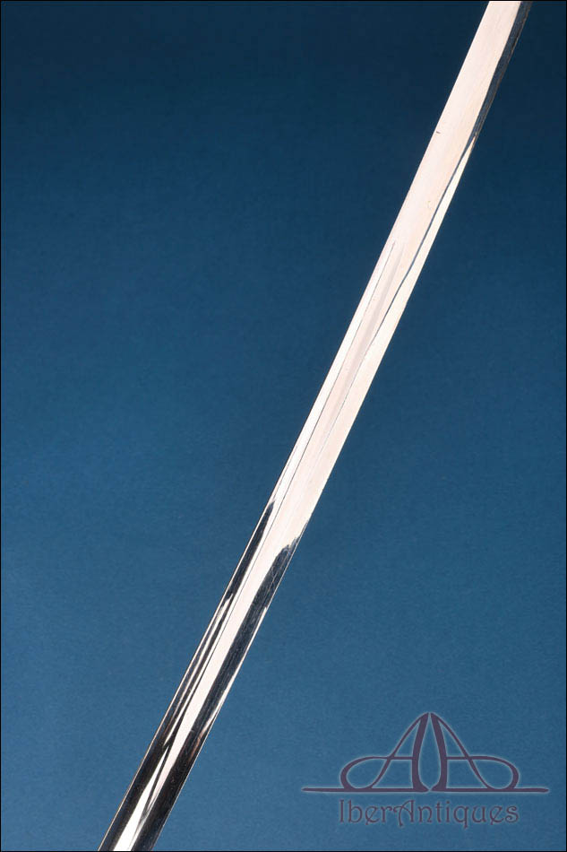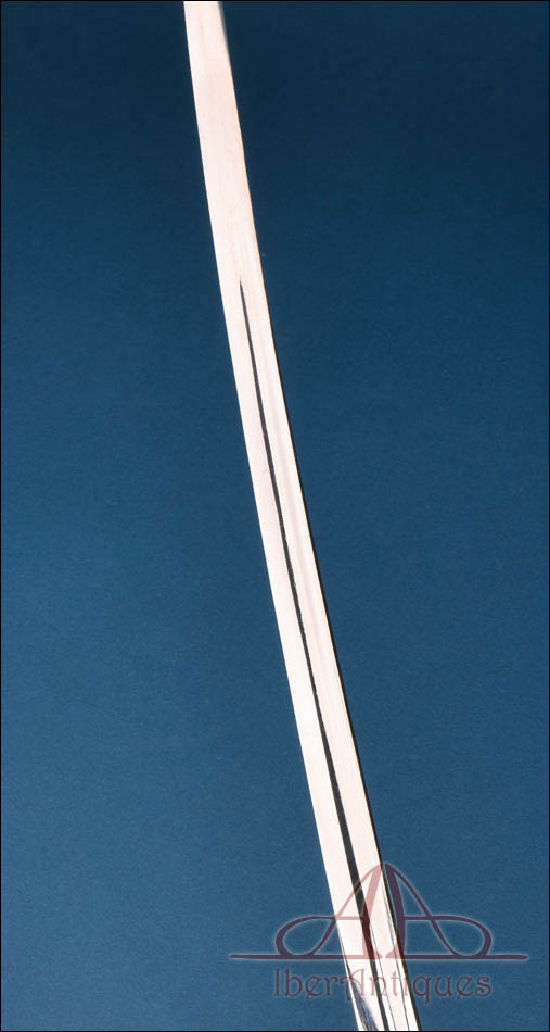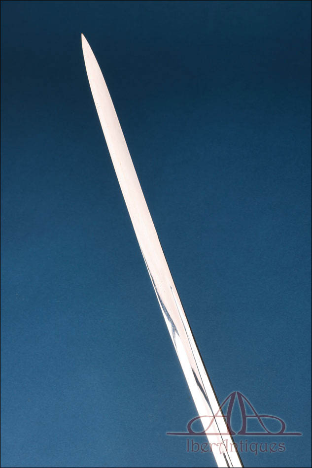 El estado general es muy bueno dentro de su antigüedad. La montura conserva bien su forma y buena parte de su presencia dorada, el puño mantiene correctamente su estructura aunque con desgastes en la cobertura, la hoja destaca por su excelente estado de conservación y la vaina sigue cumpliendo bien su función estética y estructural a pesar del desgaste superficial y de las pérdidas de acabado propias del uso. Se trata, por ello, de un ejemplar especialmente atractivo por su buena presencia, por la claridad de su iconografía y por la calidad visual de la hoja.