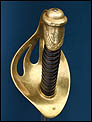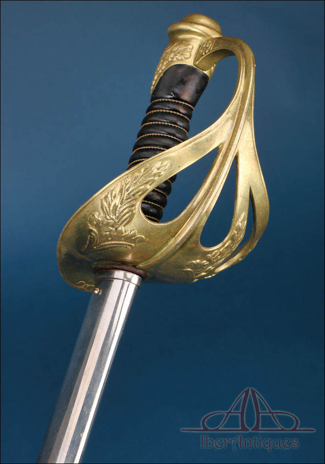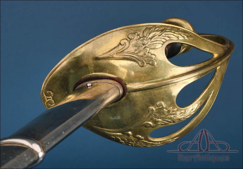 La montura está realizada en latón dorado y presenta una configuración muy característica del modelo, con amplio plato de guardia y contra guarda calada que forma un conjunto armónico y de gran personalidad. La estructura protege bien la mano y desarrolla tres amplias aberturas, siguiendo un diseño elegante y dinámico que distingue claramente esta familia de sables franceses. La decoración cincelada, visible en la montura, se organiza en torno a motivos vegetales de hojas de laurel, aportando riqueza visual.