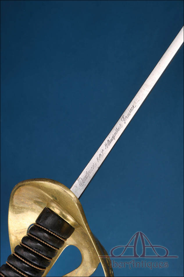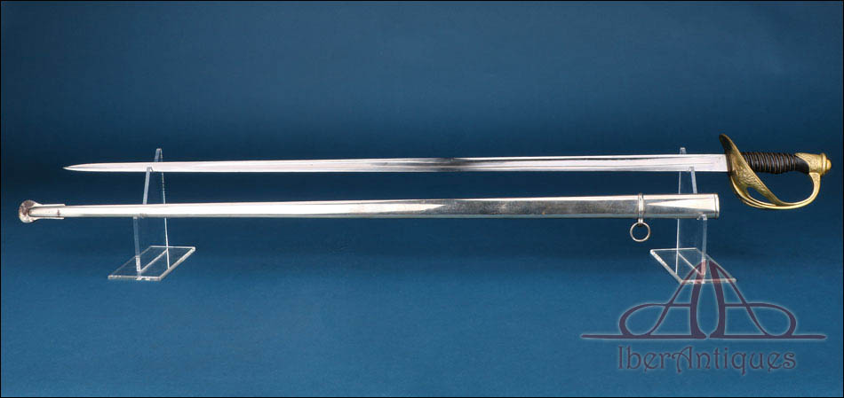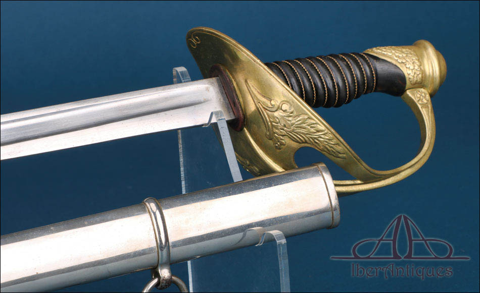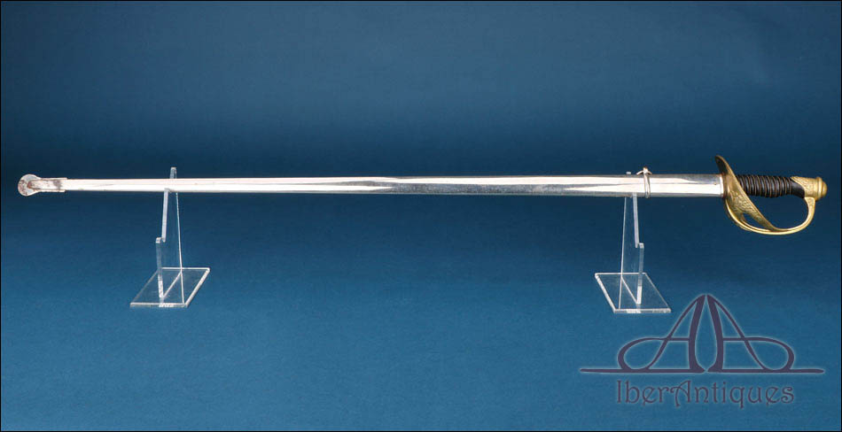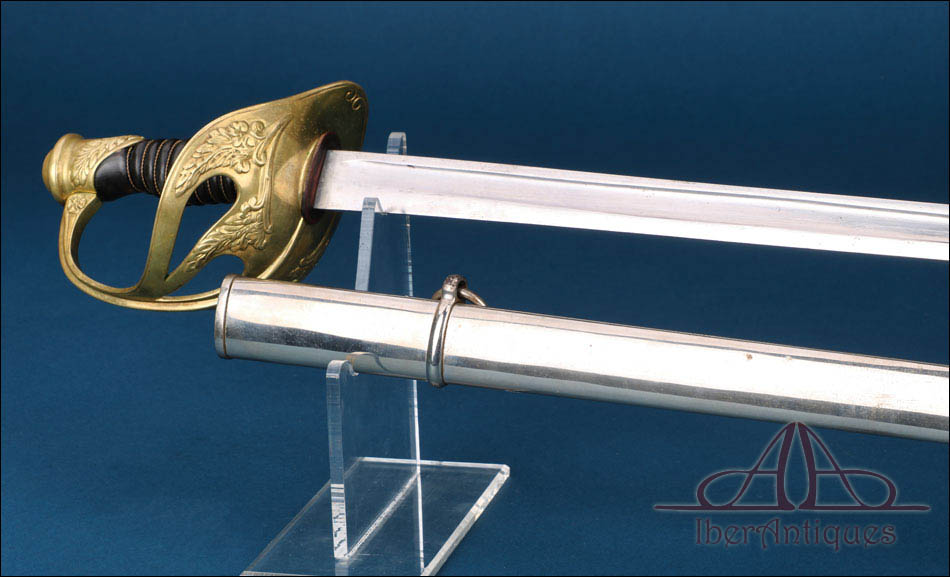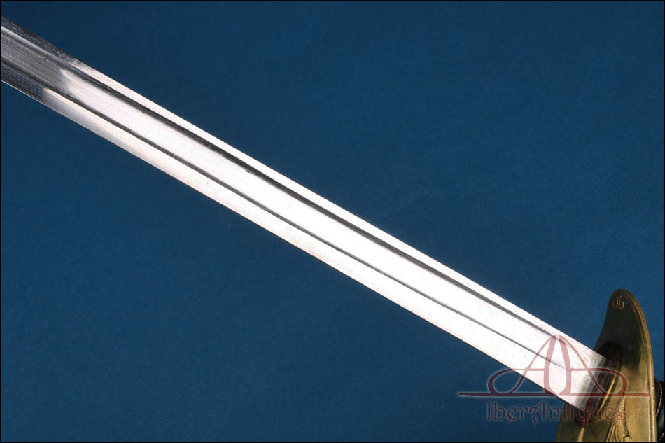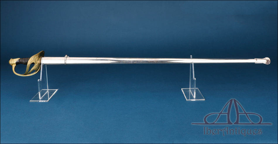 Antiguo sable francés de oficial de caballería de línea, correspondiente al modelo 1896, pieza de gran elegancia y marcada presencia militar, muy representativa de la oficialidad francesa de finales del siglo XIX y comienzos del XX. Se trata de un arma reglamentaria de porte distinguido, concebida para oficiales de caballería y caracterizada por una montura sumamente envolvente, una hoja larga y poderosa y una silueta refinada que combina funcionalidad, protección de la mano y un claro sentido estético.