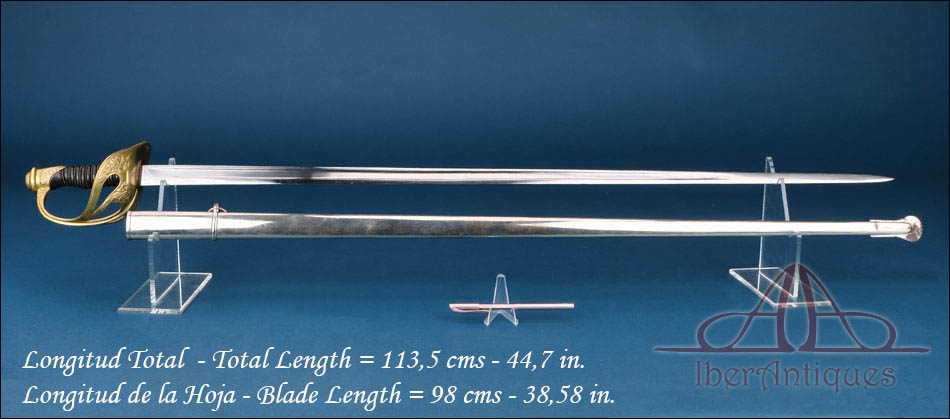 Medidas: Longitud total del sable: 113,5 cm (44.7 in). Longitud de la hoja: 98 cm (38.58 in).
