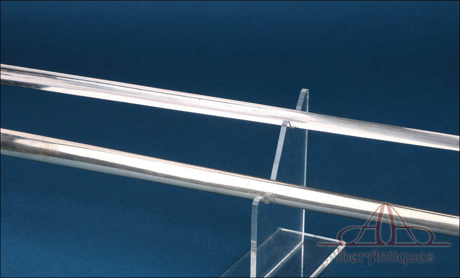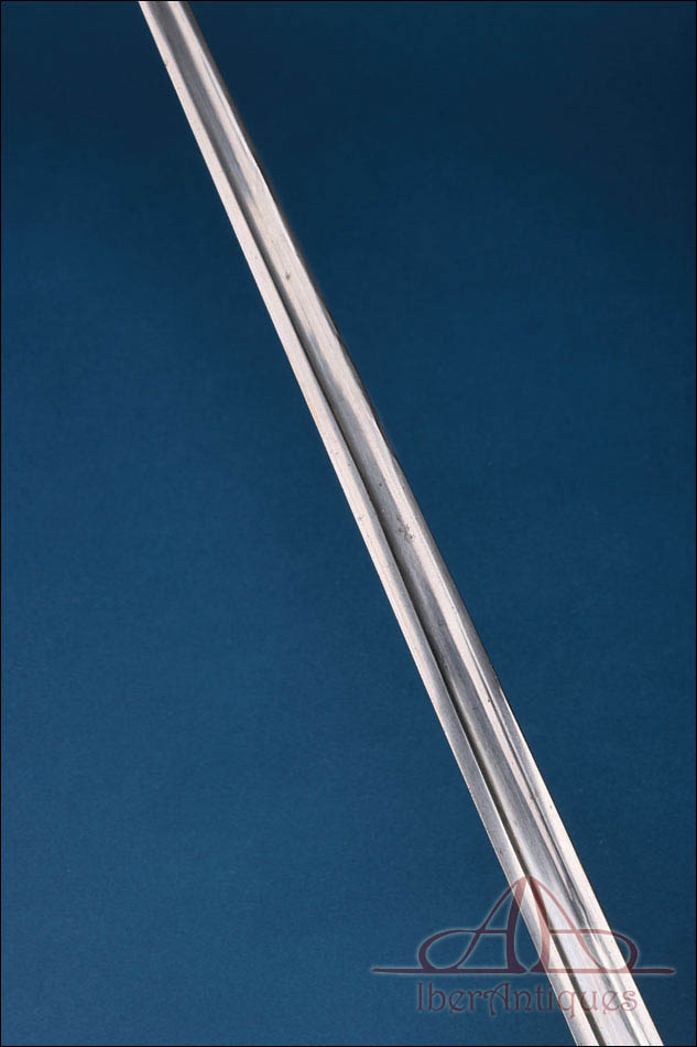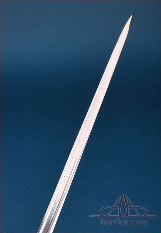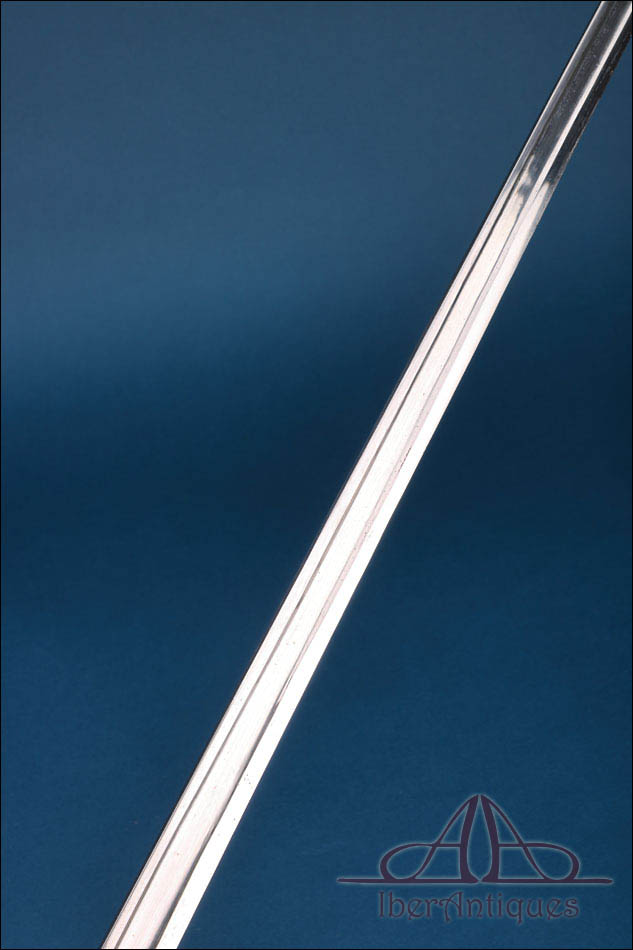 La hoja es larga, recta, de gran elegancia y se encuentra en excelente estado de conservación. En el lomo se aprecia la firma Coulaux & Cie Klingenthal France, dato especialmente importante, ya que vincula la pieza con uno de los grandes nombres de la fabricación de armas blancas francesas. La vaina es metálica con un solo brazalete con anilla de suspensión. Muestra desgaste superficial normal de uso y antigüedad, con algunas marcas y roces visibles, especialmente hacia la extremidad.