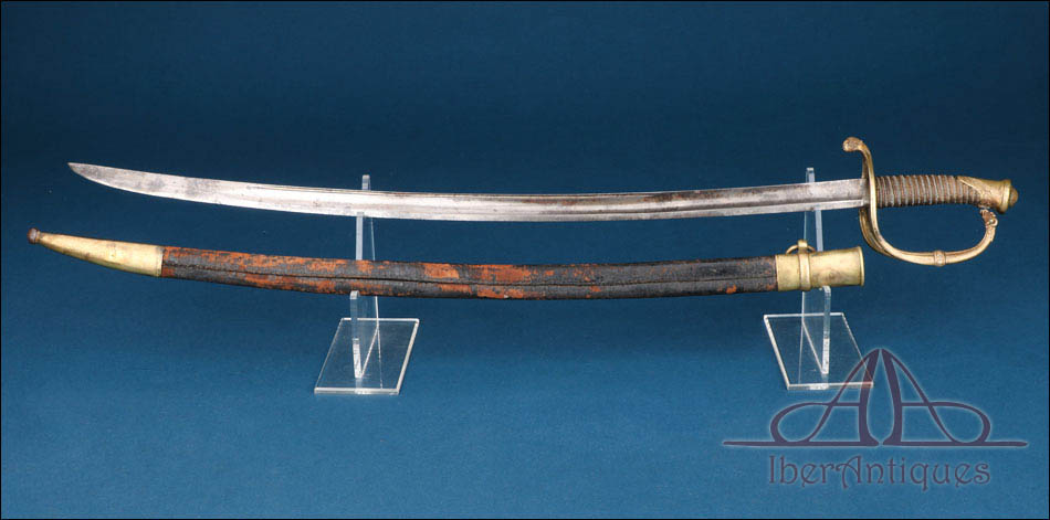 Antiguo sable francés de oficial de infantería, correspondiente al modelo 1821, pieza de porte elegante y marcada personalidad militar, muy representativa de la oficialidad francesa del siglo XIX. Se trata de un arma reglamentaria de gran sobriedad formal, concebida para acompañar el uniforme de oficial y caracterizada por una montura de latón bien proporcionada, una hoja curva de perfil clásico y una vaina de cuero con guarniciones metálicas.