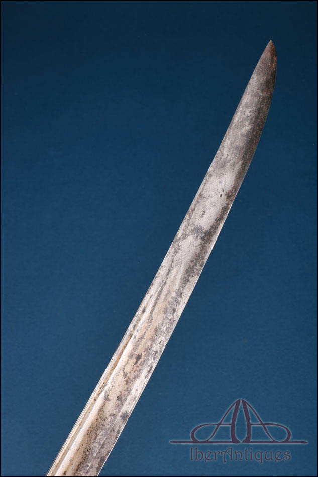 El estado general es bueno dentro de su antigüedad. La montura conserva bien su estructura y buena parte de su lectura decorativa, el puño mantiene correctamente su alambrado, la hoja presenta desgaste superficial compatibles con la época, y la vaina, aunque fatigada y con desgaste notable en el cuero, sigue entera y acompañando bien al arma. Se trata de una pieza auténtica, con carácter y con una presencia histórica muy atractiva.