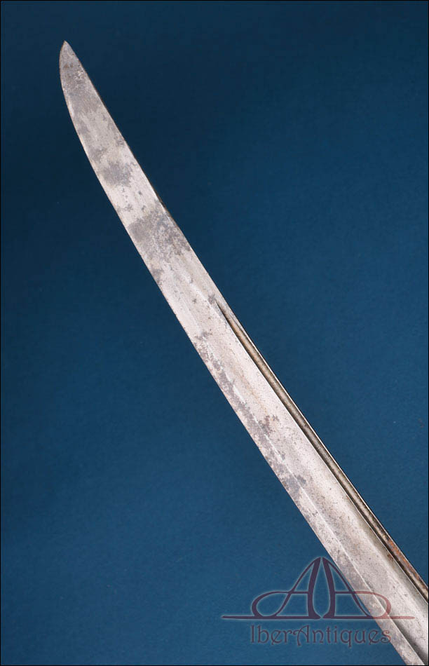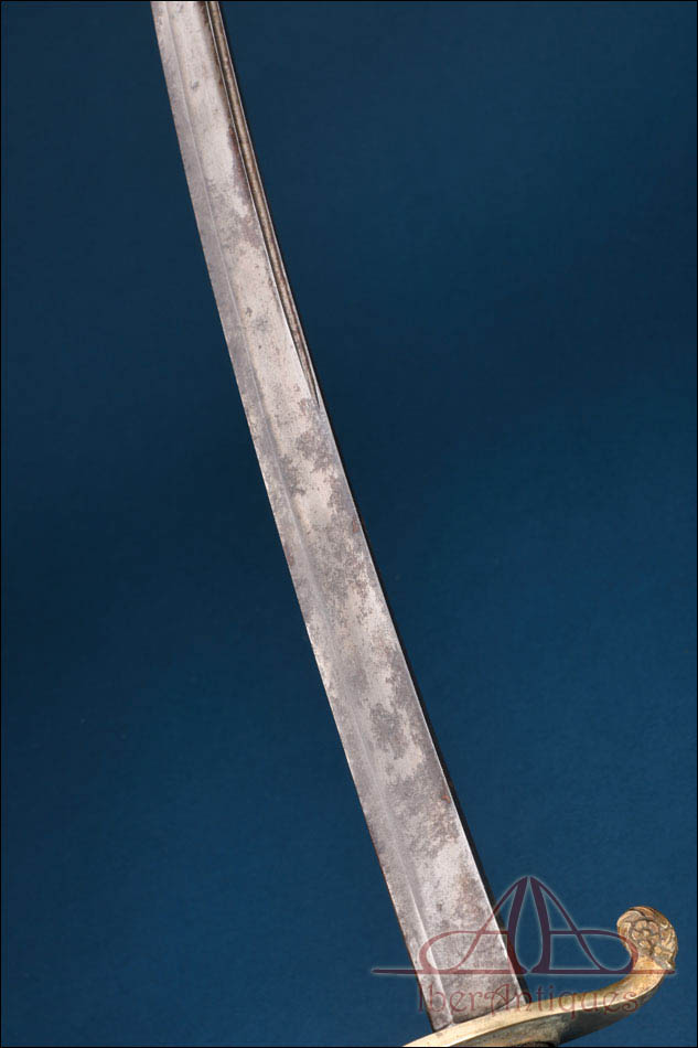 La hoja es curva, de un solo filo y muy bien proporcionada, con una silueta estilizada y elegante. Conserva la punta correctamente formada. Presenta pátina y manchas, visibles en varias zonas, pero mantiene bien su integridad y su presencia histórica. La vaina conserva cuerpo de cuero negro, hoy con desgaste acusado, resequedad, pérdidas de superficie y una pátina muy marcada por el paso del tiempo. Aun así, sigue completa y acompaña correctamente al sable. Las monturas de latón conservan buen estado general, con una anilla de suspensión todavía presente, y la contera mantiene bien su forma.