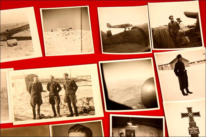 Colección personal de sesenta fotografías pertenecientes a un soldado de la Legión Cóndor durante la 2ª Guerra Mundial. Este increíble documento histórico cuenta con imágenes de la vida personal del soldado, en momentos de descanso, de relajación, en su boda o durante su vida cotidiana, pero también muestra fotografías de la guerra, muy posiblemente en el Frente del Este. Las fotografías son una tirada original de la época.