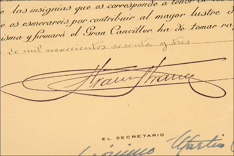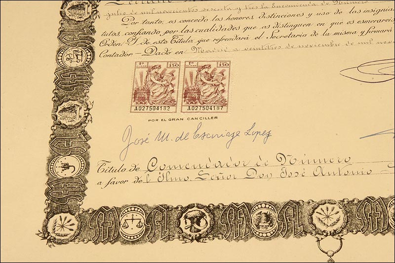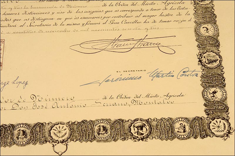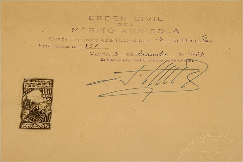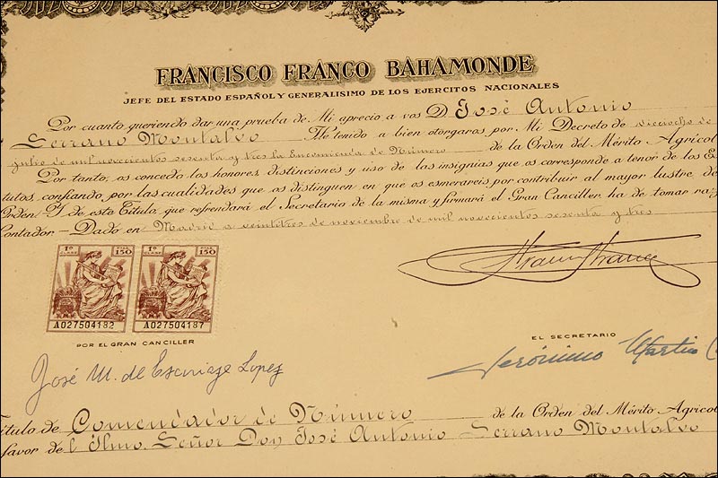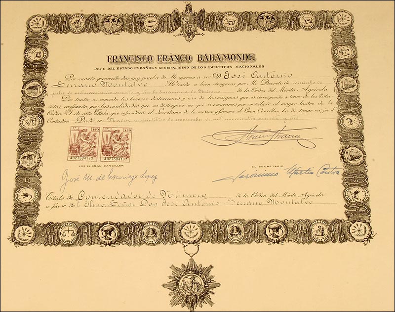 Bella y prestigiosa condecoración consistente en la Orden al Mérito Agrícola, otorgada por el gobierno de Francisco Franco a José Antonio Serrano Montalvo en el año 1963. El gran valor, tanto material como histórico, de esta singular pieza de coleccionista se ve enaltecido por el Diploma de Concesión que la acompaña. En este documento podemos ver el nombre del galardonado escrito a mano, y también las firmas de Francisco Franco, el Gran Canciller y el Secretario, así como la fecha de concesión. La condecoración le fue concedida a Serrano Montalvo, destacada figura de la vida política de la España del momento, que ostentó el cargo de Jefe Local del SindicatoEspañol Universitario (SEU), y posteriormente fue Gobernador Civil de Lérida y también de Tarragona.