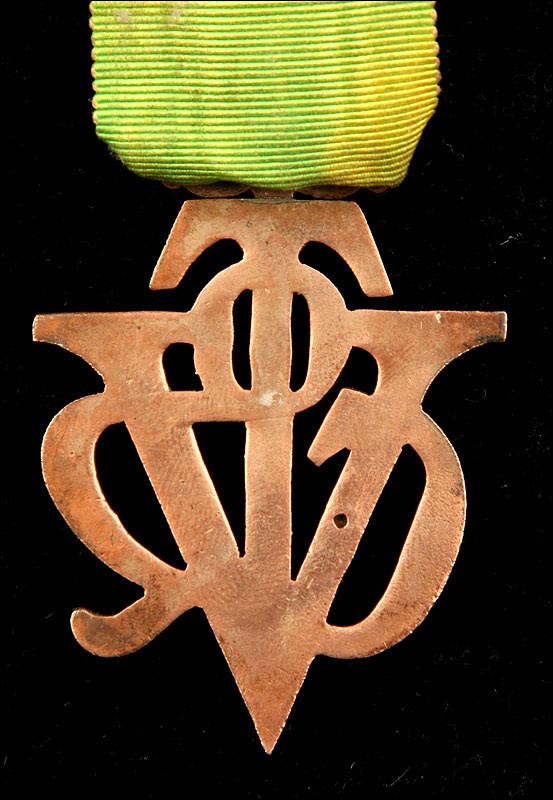 Se trata de una pieza de plata coloreada en bronce, en la cual se reproduce el símbolo del Víctor. Este símbolo también recibe el nombre de Victorioso o Símbolo de la Victoria, y se empezó a utilizar en el Bajo Imperio Romano. Se cree que deriva del símbolo cristiano del crismón. Algunas universidades adoptaron este símbolo para sus propias organizaciones, como por ejemplo la de Salamanca, que lo hizo en el siglo XIV. En realidad, se trata de un acrónimo que contiene todas las letras de la palabra Victor. Como curiosidad, reseñar que hay estudios que indican que al símbolo se le añadieron elementos esotéricos para proteger a Franco, e incluso quien piensa que contiene simbología masónica.